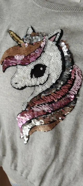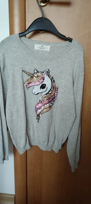 Maglioncino grigio taglia 6/8 anni (122/128 cm) marca H&M, Nuovo, Mai indossato! Ha un elegante ricamo Unicorno con paillettes reversibili. Adatto a stagione autunnale o primaverile. Tessuto 100% cotone.