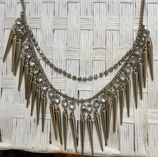Collana statement con un design audace e scintillante. - Punte metalliche dorate e argentate. - Dettagli con strass luminosi. - Design a più fili.