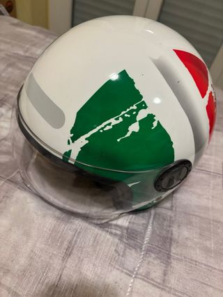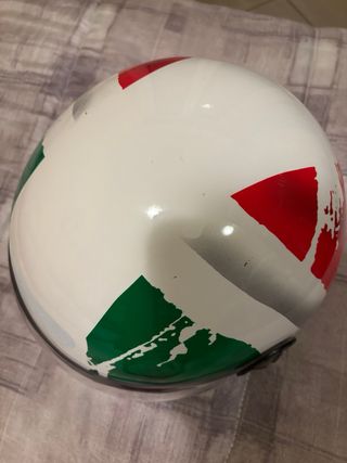 Casco da moto con un design accattivante. - Colore bianco di base. - Grafica ispirata alla bandiera italiana. - Visiera trasparente. - Dettagli grigi -marca : ridemotorcycles
