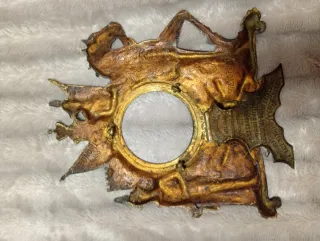 Cornice decorativa con stemma originale dei Carabinieri. - Realizzata in metallo. - Raffigura un cavallo, soldati e un castello. - Presenta un emblema centrale con spade e trombe.