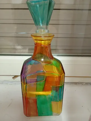 Elegante bottiglia in vetro decorata a mano con un motivo colorato. - Vetro dipinto con colori vivaci. - Tappo decorativo in vetro.