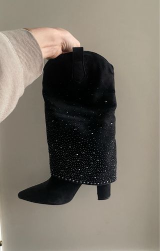 Eleganti stivali neri con dettagli scintillanti. - Tomaia in materiale scamosciato. - Decorazione con strass. - Tacco robusto.