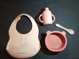 Set completo per la pappa del neonato Bamboom+. - Bavaglino in silicone con tasca raccogli-pappa. - Tazza con beccuccio e manici. - Ciotola con base antiscivolo e design a orsetto. - Cucchiaino in silicone.