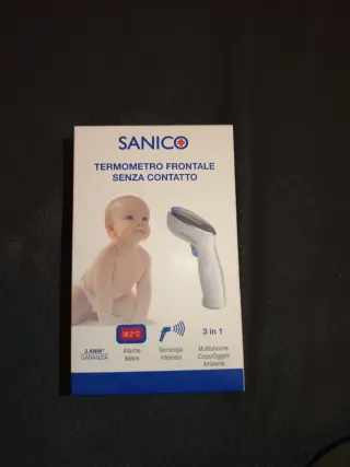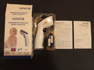 Termometro frontale Sanico senza contatto, ideale per misurare la temperatura corporea. - Tecnologia a infrarossi. - Allarme febbre. - Multifunzione: corpo, oggetti, ambiente. - Funzione a batteria