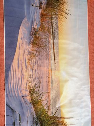 Bellissima tela di grandi dimensioni che raffigura una scena di spiaggia al tramonto. Aggiunge un tocco di colore e serenità a qualsiasi ambiente. - Rappresentazione di una spiaggia con erba. - Colori caldi del tramonto. - misure in foto