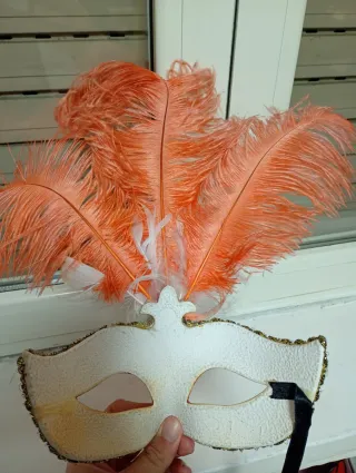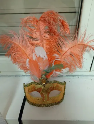 Elegante maschera veneziana in cartapesta, perfetta per feste o collezioni. Decorata con piume arancioni e dettagli dorati. - Materiale: Cartapesta - Colore principale: Arancione - Decorazioni: Piume, glitter dorati e un inserto centrale color ambra.