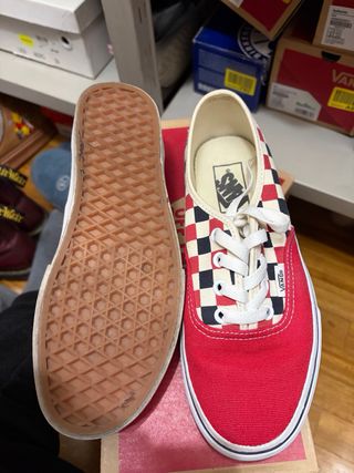Scarpe Vans con un design a scacchiera distintivo. - Tomaia in tessuto rosso. - Inserti a scacchiera. - Lacci bianchi.
