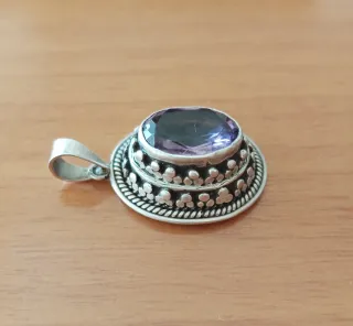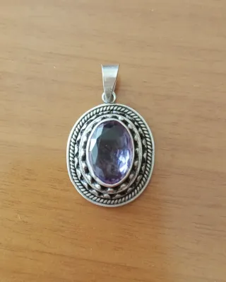 Elegante ciondolo in Argento 925 con una splendida ametista naturale taglio sfaccettato, bordatura lavorata con dettagli intrecciati.