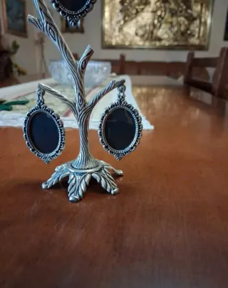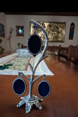 Elegante portafoto a forma di albero, perfetto per esporre i tuoi ricordi più cari. - Struttura in metallo finemente lavorata. - Tre cornici ovali pendenti. - Base stabile e decorativa.