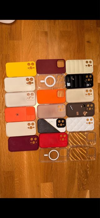Set di cover per iPhone 16 Pro. - Cover gialla - Cover bordeaux - Cover bianca a righe - Cover trasparente con anello magnetico - Cover nera con dettagli - Cover beige - Cover arancione - Cover rosa - Cover marrone con orsetto - Cover bianca trapuntata - Cover beige con logo - Cover nera e bianca - Cover rossa - Cover trasparenti con fantasia