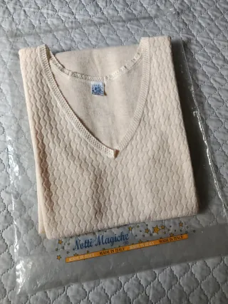 Maglia intima da donna a mezza manica con lavorazione. -Taglia 4 - Tessuto morbido e confortevole. - Scollo a V con merletto. -Bordi rifiniti. -Ascelle traspiranti -Lana irrestringibile pettinata Spedizione solo con Poste Italiane e InPost