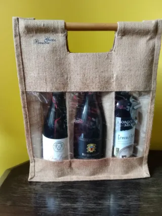 Elegante borsa porta bottiglie in juta, perfetta per trasportare le tue bevande con stile. - Materiale resistente e naturale. - Manici in legno per una presa comoda. - Finestra trasparente per visualizzare il contenuto.