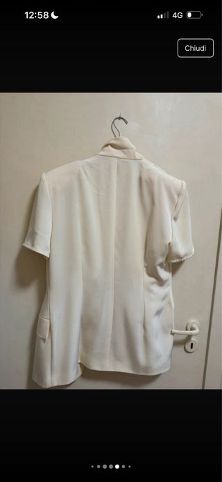 Elegante giacca corta. - Maniche corte. - Tasche frontali. - Chiusura con bottone. Giacca Indossata 1 volta, leggere macchine su tasca(come da foto). 100% Crepe Taglia 48