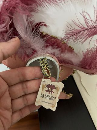 Splendida maschera veneziana, perfetta da appendere o per un regalo speciale. Ricca di dettagli e decorazioni dorate fatte a mano da artigiani veneziani. - Decorata con piume rosa. - Finiture in tessuto e velluto. - Comprensiva di appendino. - Comprensiva di certificato di Garanzia - Altezza circa 16cm