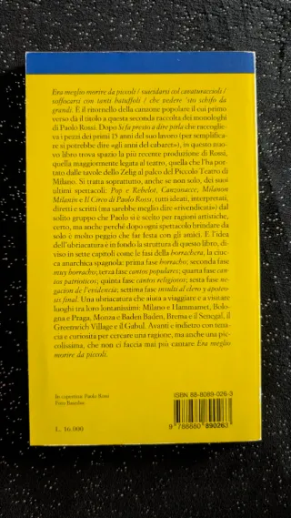Vendo il libro "Era meglio morire da piccoli? Nuovi monologhi" del grande comico e attore Paolo Rossi, edito da Baldini & Castoldi. Si tratta della seconda raccolta di monologhi dell'artista, che include i testi dei suoi spettacoli storici come Pop e Rebelot, Canzonacce e Il Circo di Paolo Rossi. Un viaggio satirico diviso in sette capitoli che seguono le fasi della "borrachera" (l'ubriacatura anarchica spagnola). Autore: Paolo Rossi Editore: Baldini & Castoldi Anno di edizione: Febbraio 1995 (Prima Edizione) Condizioni: Ottime. Il libro è ben conservato, le pagine sono integre e la brossura è solida. Leggeri e naturali segni del te