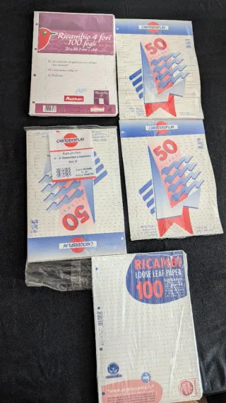 stock di fogli di ricambio per raccoglitore ad anelli, formato A4, tutti rigorosamente nuovi e sigillati. Il lotto è composto da un totale di 450 fogli con rigatura Modello C (righe per 4ª e 5ª elementare, medie e superiori). Il pacchetto include: 1 confezione Pigna Quaxima da 100 fogli (60g/m²). 1 multipack Cartodisplay contenente 3 pacchetti da 50 fogli l'uno (totale 150 ff). 2 pacchetti singoli Cartodisplay da 50 fogli l'uno (totale 100 ff). 1 confezione Auchan da 100 fogli (66g/m², carta bianca perforata). Caratteristiche: Formato: A4 (21 x 29,7 cm). Foratura: Standard per raccoglitori a 4 anelli. Condizioni: Nuovi, mai aperti.