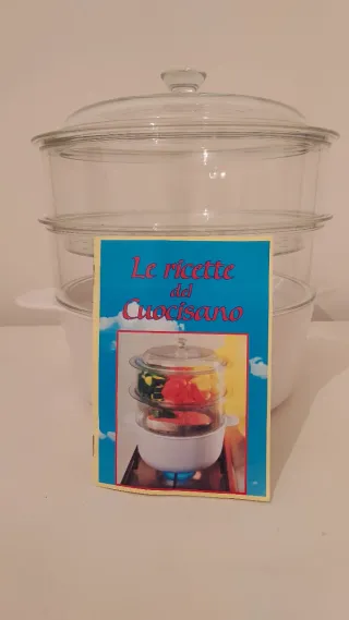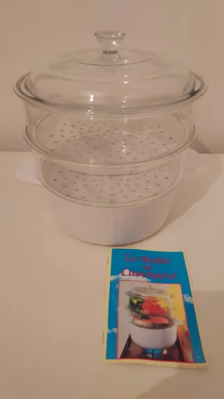 Vaporiera a più livelli per cucinare in modo sano. - Ciotola principale in ceramica - Due cestelli trasparenti in plastica - Coperchio in vetro con pomello.