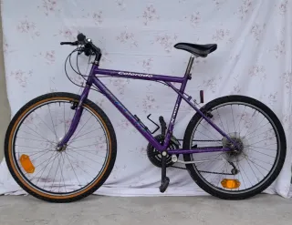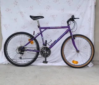 Bicicletta da montagna con ruote da 26 pollici e cambio Shimano. Usata. - Telaio viola. - Gruppo cambio Shimano 200GS. - 21 velocita - Manubrio in alluminio - Cerchi in alluminio FIR - Campanello - Cavalletto in alluminio - Catarifrangente posteriore - Catarifrangenti ruote - Porta borraccia - Sgancio ruote rapido - Bloccaggio sella rapido - Sella Royal Italia