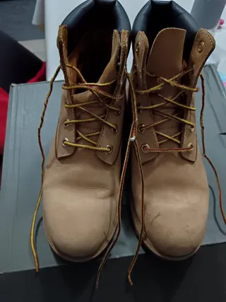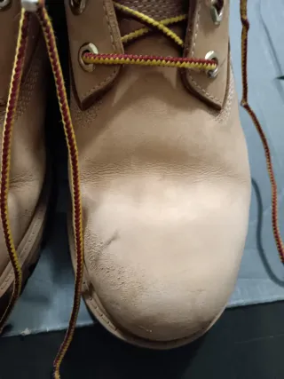 Stivaletti Timberland da donna in pelle scamosciata. - Colore beige con dettagli marrone. - Lacci bicolore giallo e rosso. - Fodera interna nera.