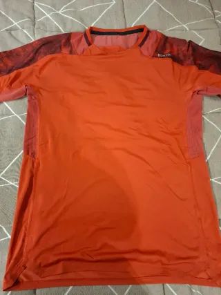 Maglietta sportiva Domyos a maniche corte. - Tessuto tecnico traspirante. - Inserti laterali a coste. - Maniche con stampa grafica.