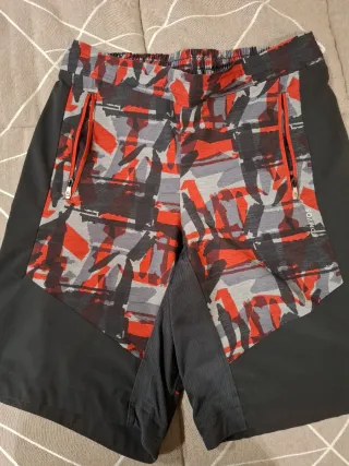 Pantaloncini sportivi Domyos con una fantasia accattivante. - Fantasia geometrica rossa, grigia e nera. - Inserti laterali in tessuto tecnico nero. - Tasche laterali con zip. - Vita elasticizzata.