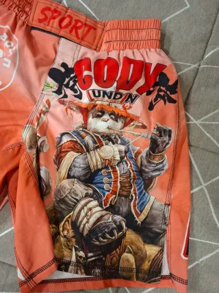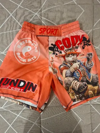 Pantaloncini sportivi con stampa personalizzata. - Stampa di un panda con cappello e abiti tradizionali. - Scritta Cody Lundin in evidenza. - Logo Westampton Martial Arts sul lato sinistro. - Dettaglio SPORT sulla cintura.