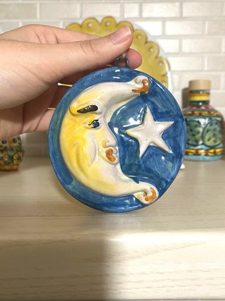 Luna in ceramica di Caltagirone (Sicilia, Italia) artigianale dipinta a mano, color blu e giallo. Da appendere al muro.