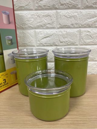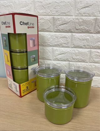 Set di 3 barattoli da cucina Guzzini. - Colore verde brillante. - Coperchio trasparente ermetico. - Ideali per conservare alimenti.
