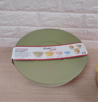 Set di tre ciotole in plastica, perfette per la cucina. - Ciotola blu - Ciotola verde - Ciotola gialla