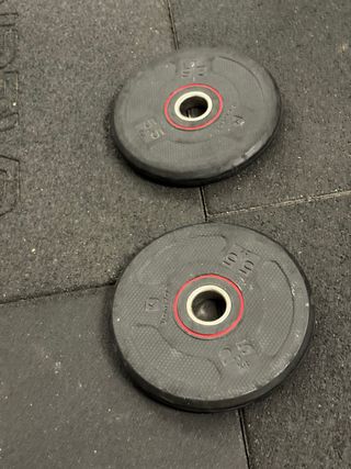 Set di due dischi da 2.5 kg ciascuno, ideali per allenamenti con bilanciere. - Rivestimento in gomma per proteggere pavimenti e attrezzature. - Foro centrale da 28 mm per bilancieri standard. - in buone condizioni ma leggermente usurati come si vede in foto