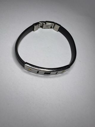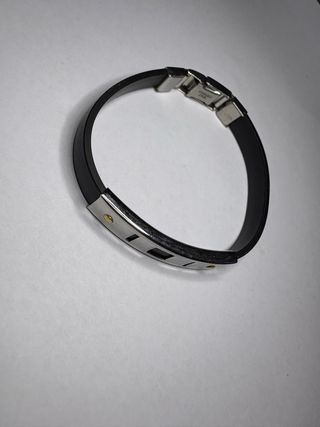 Elegante braccialetto con cinturino in gomma nera e dettagli in metallo argentato. - Chiusura a scatto in acciaio inossidabile. - Piastra centrale in metallo con incisioni. - Design moderno e versatile.