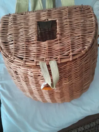 Cesta zaino vintage, perfetta per la pesca o come accessorio di moda. - Realizzata in vimini intrecciato. - Dimensioni approssimative: 34 cm x 34 cm. - Manici in tessuto color verde oliva. - Dettaglio con piccola finestra sul coperchio.