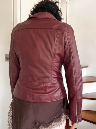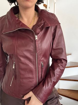 Elegante giacca in vera pelle, un capo versatile per ogni occasione. - Design moderno con zip asimmetrica. - Collo alto con chiusura a zip. - Tasche laterali con zip. - Maniche lunghe. taglia 42 Italiana