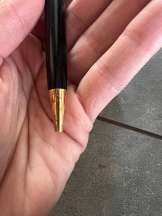 nna Punta retrattile a sfera -Montolanc Meisterstück • Finiture dorate (gola-coated). • Corpo in resina nera lucida con la caratteristica stella bianca Montblanc sulla parte superiore. • Anelli centrali dorati con incisione "Montblanc Meisterstück". • Confezione classica nera con interno dorato, tipica dei modelli Meisterstück. Specifiche principali • Lunghezza: circa 13,5 cm. • Peso: 22-25 g. La punta presenta qualche imperfezione dovuta agli anni e all'utilizzo