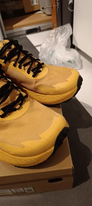Scarpe da trail running Topo Athletic MTN Racer 4. - Suola Vibram. - Design con lacci neri. - Tomaia in tessuto giallo e arancione. Taglia 44.5 10.5 28.5cm Scarpe usate per 12km al massimo...come niove