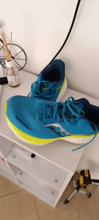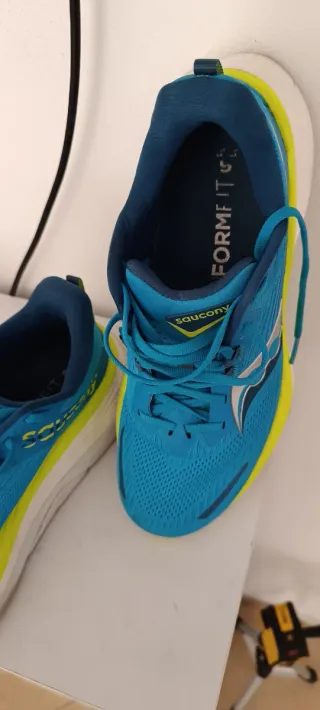 Scarpe da corsa Saucony Hurricane 24. - Colore blu con dettagli gialli. - Tomaia in mesh traspirante. - Logo Saucony sul lato. Taglia 44.5. 10.5. 28.5cm Usate 6/7volte sul tapis roullant