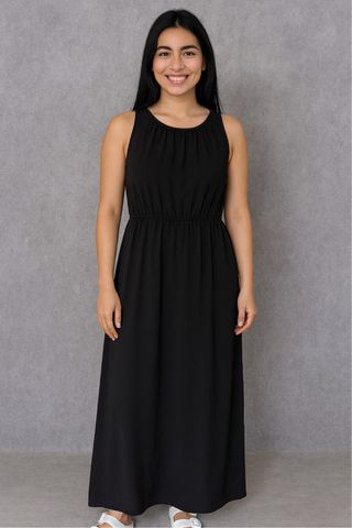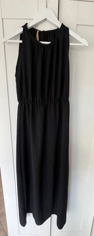 Un abito lungo nero, perfetto per ogni occasione. - Scollo rotondo. - Vita elasticizzata. - Tessuto leggero e fluido.