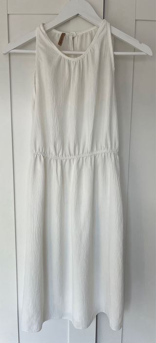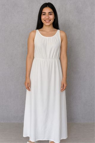 Elegante abito lungo in tessuto bianco. - Scollo rotondo. - Maniche corte. - Elastico in vita. - Lunghezza maxi.