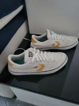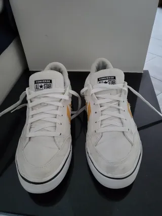 Scarpe Converse All Star Player in ottime condizioni. - Tomaia in tela bianca con dettagli gialli. - Logo All Star sulla linguetta. - Suola in gomma vulcanizzata.