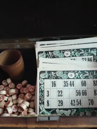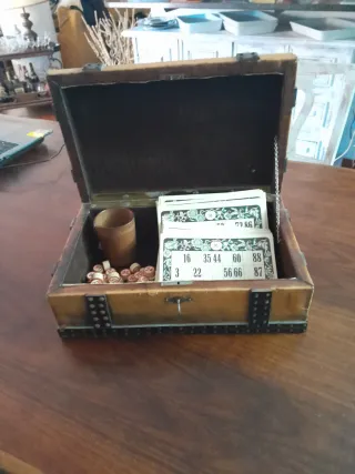 Bellissima cassetta vintage, perfetta per conservare i tuoi giochi da tavolo o come pezzo d'arredo. - Realizzata in legno con finiture in metallo. - Presenta una serratura rotta, che aggiunge carattere. - Include carte da tombola e numeri in legno.