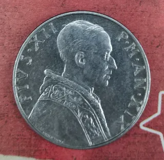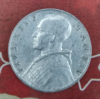 Moneta da 50 Lire del Vaticano, anno 1956. - Raffigura una figura allegorica. - Dritto: CITTA' DEL VATICANO - Rovescio: LIRE 50 e 1956 - Presenta la scritta SPES sul bordo inferiore.