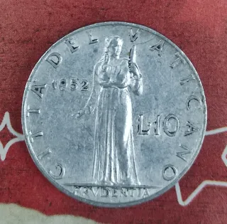 Moneta da 10 Lire della Città del Vaticano, anno 1952. - Dritto: Figura femminile con fascio e corona. - Rovescio: Stemma papale. - Valore: 10 Lire. - Anno: 1952. - Emittente: Città del Vaticano.