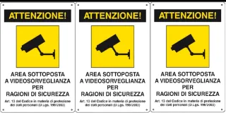 Set di 3 cartelli di segnalazione ATTENZIONE!. - Area sottoposta a videosorveglianza. - Per ragioni di sicurezza. - Conforme all'Art. 13 del Codice in materia di protezione dei dati personali (D.Lgs. 196/2003)