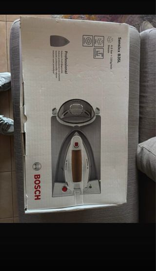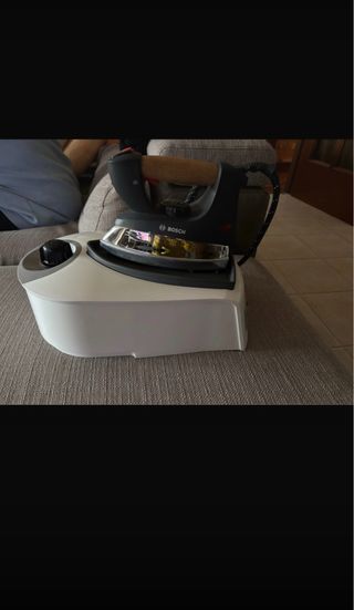 Ferro da stiro a caldaia marca Bosch, con base bianca e finiture nere. - Design moderno. - Manico in legno. - Serbatoio trasparente per il vapore.