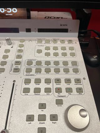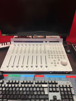 Controller DAW Icon Qcon Pro, ideal para producción musical. - Superficie de control con faders y botones. - Diseño plateado y blanco.