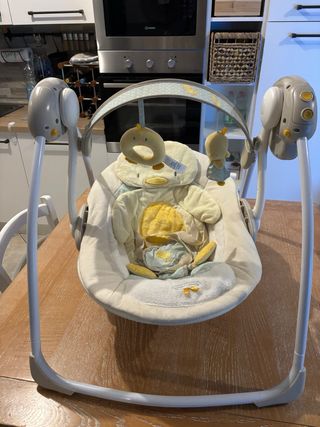 Altalena automatica in stato eccellente, unico difetto manca un clip di aggancio di un piedino, sennò è praticamente impeccabile. Altalena automatica per neonati con design a tema anatroccoli. - Seduta imbottita e confortevole. - Arco giochi con simpatici pupazzi. - Tessuto morbido e lavabile.