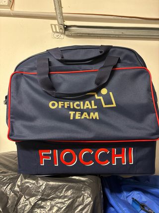 Borsone sportivo con logo Official Team e nome Fiocchi. - Colore blu con dettagli rossi. - Logo Official Team dorato. - Nome Fiocchi in bianco e rosso.
