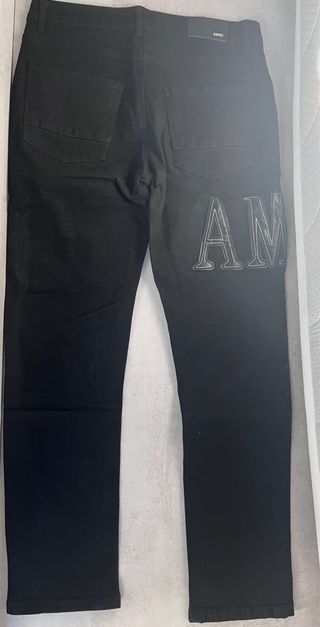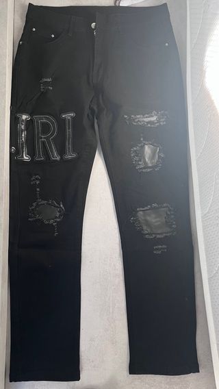 Jeans Amiri neri con dettagli strappati e patch. - Logo Amiri applicato. - Patch in ecopelle. - Design strappato.