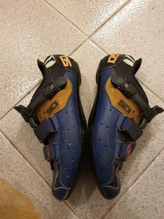 Scarpe da ciclismo Sidi usate, taglia 45. Ideali per la bici da corsa. - Chiusura con velcro. - Design blu con dettagli marroni e neri. - Logo Sidi visibile. Senza tacchette aggancio pedali Spese spedizione escluse
