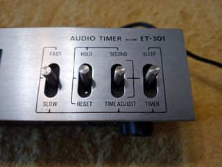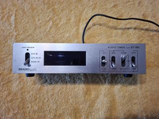 Timer audio Hi-Fi IRRADIO modello ET-301. - Indicatore di alimentazione. - Selettore con opzioni: AUTO ON, AUTO ON-OFF, MANUAL ON. - Funzioni: FAST, HOLD, SECOND, SLEEP. - Pulsanti: SLOW, RESET, TIME ADJUST, TIMER. Timer Hi-Fi. Usato in buone condizioni, funzionante. E' possibile collegare due apparecchiature Hi-Fi, esempio amplificatore e sintonizzatore, avendo così la funzione di radiosveglia in quanto è possibile programmare l'accensione e lo spegnimento dopo 1 ora. Si può utilizzare anche con altre apparecchiature, tipo lampade, ventilatori ecc. Spese spedizione escluse